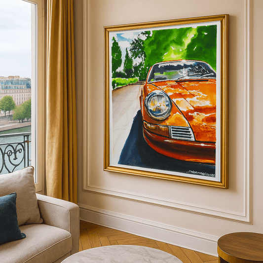 PORSCHE 912 BLUETORANGE BY THE RIVER SEINE - AUTOMOTIVE CHINA INK & WATERCOLOR PAINTINGRegular price €875Regular priceUnit price / per-