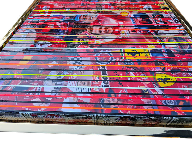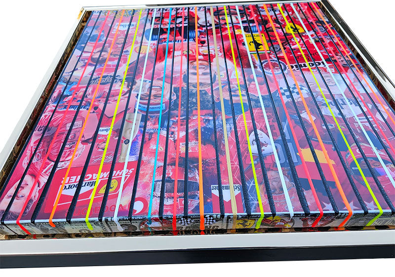This work of art, a tribute to Ferrari F1 driver Michael Schumacher, has been carefully crafted using a technique of multilayering paper collages enriched.